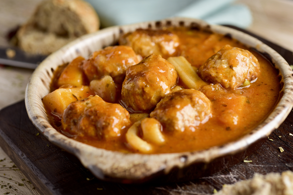 Fusión entre mar y tierra con sepia fresca y carne picada en albóndigas suaves, cocinadas en salsa de sofrito casero con guisantes tiernos.